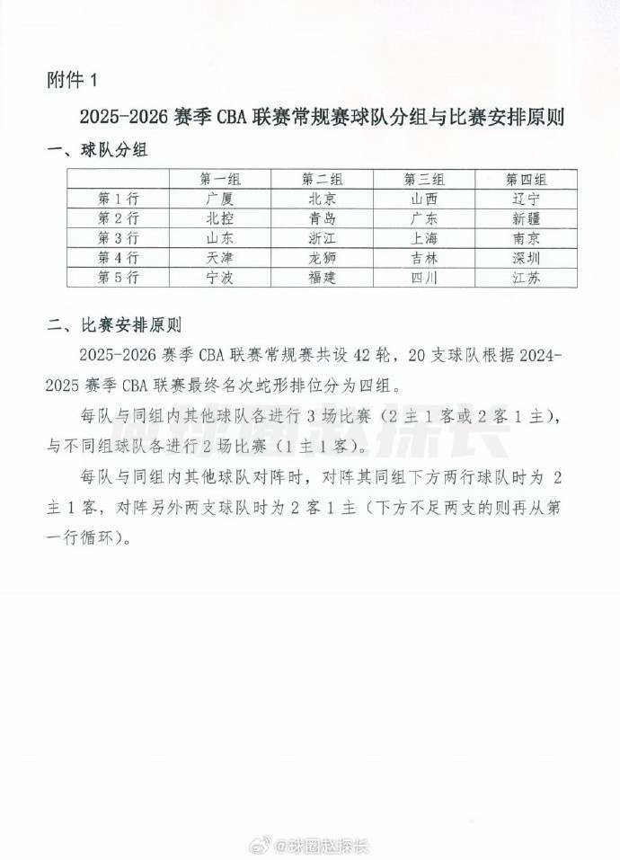 据悉,新赛季CBA各队将被分成4个小组,具体分组如下: