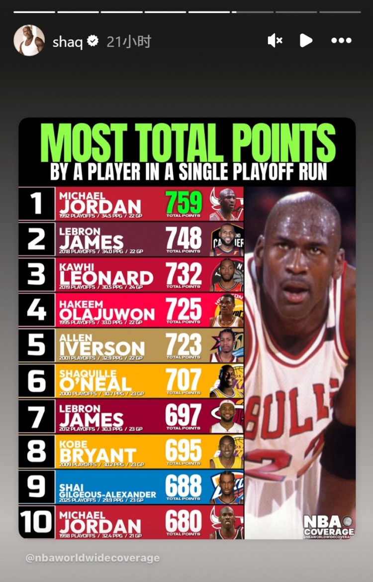 奥尼尔晒单次季后赛总分:92乔丹759分第1 18詹第2 19卡第3 SGA第9